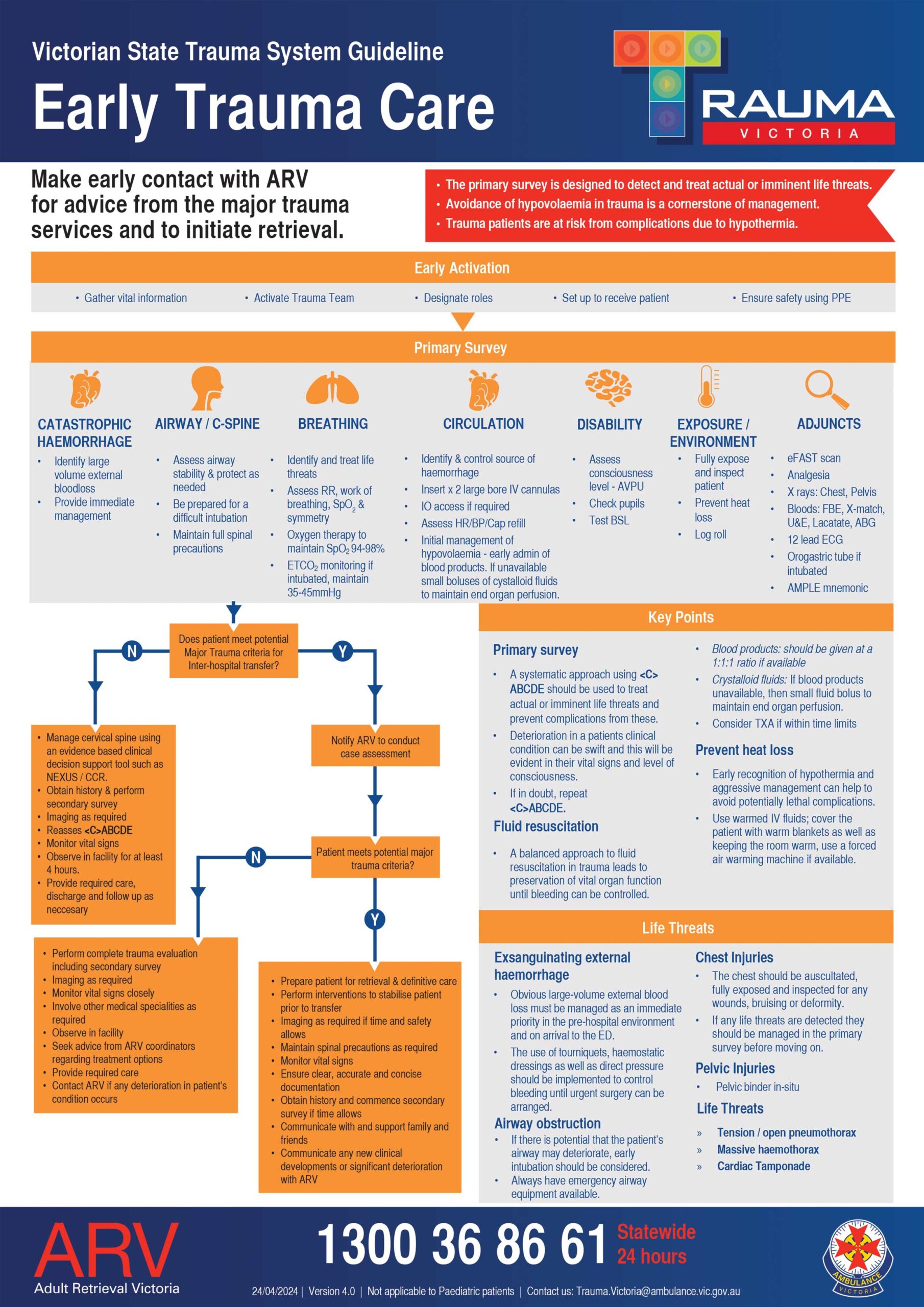 Initial assessment and management of the major trauma patient is designed to identify any actual or imminent life threats and to treat them immediately to ensure optimum resuscitation. Avoidance of hypovolaemia and hypothermia is essential to preserve vital organ function.